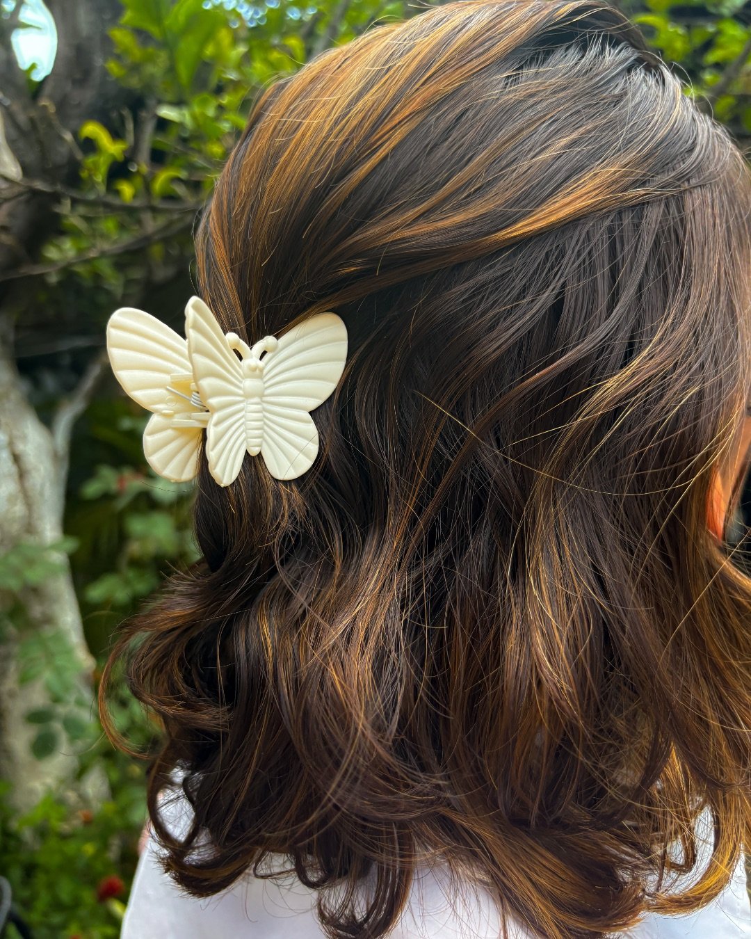 Set de 2 ganchos de mariposa tamaño mediano, uno dorado y uno color mate para crear peinados este verano.
