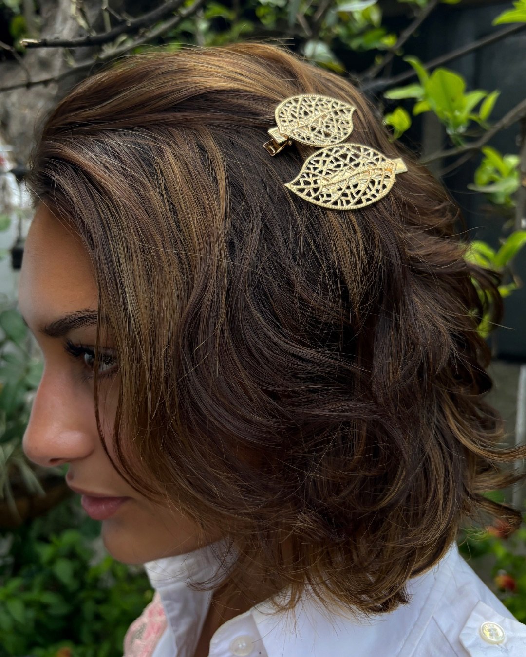 Set de dos clips para el cabello de acetato de hojas metálicas.